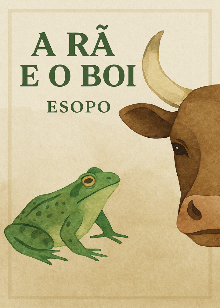Uma pequena rã tenta inchar para se igualar ao tamanho de um boi, até estourar. O conto alerta contra a vaidade e a tentativa de ser o que não se é. Com humor e clareza, Esopo oferece uma lição atemporal sobre aceitação e limites pessoais.